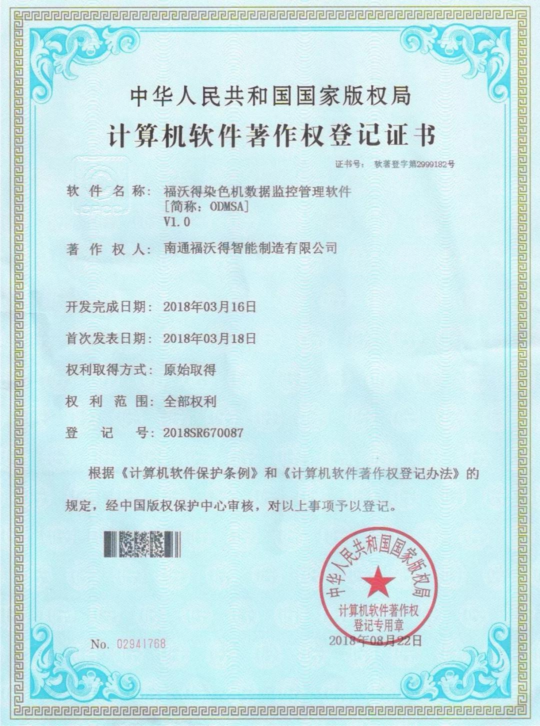 近日,福沃得智能制造获得了由国家版权局颁发的福沃得染色机数据监控管理软件【简称:ODMSA】V1 0软件著作权证书。以上软件著作权的取得有